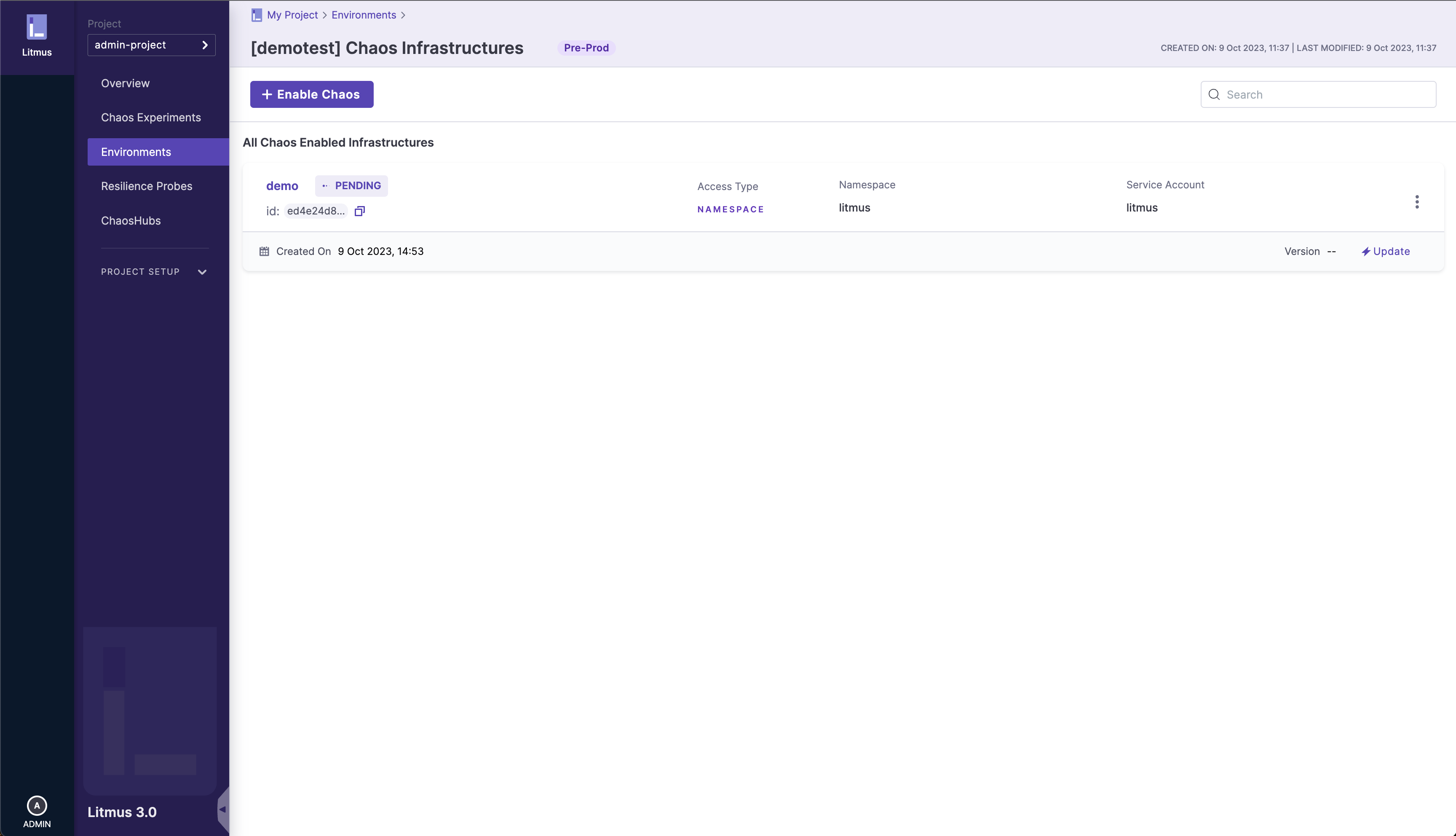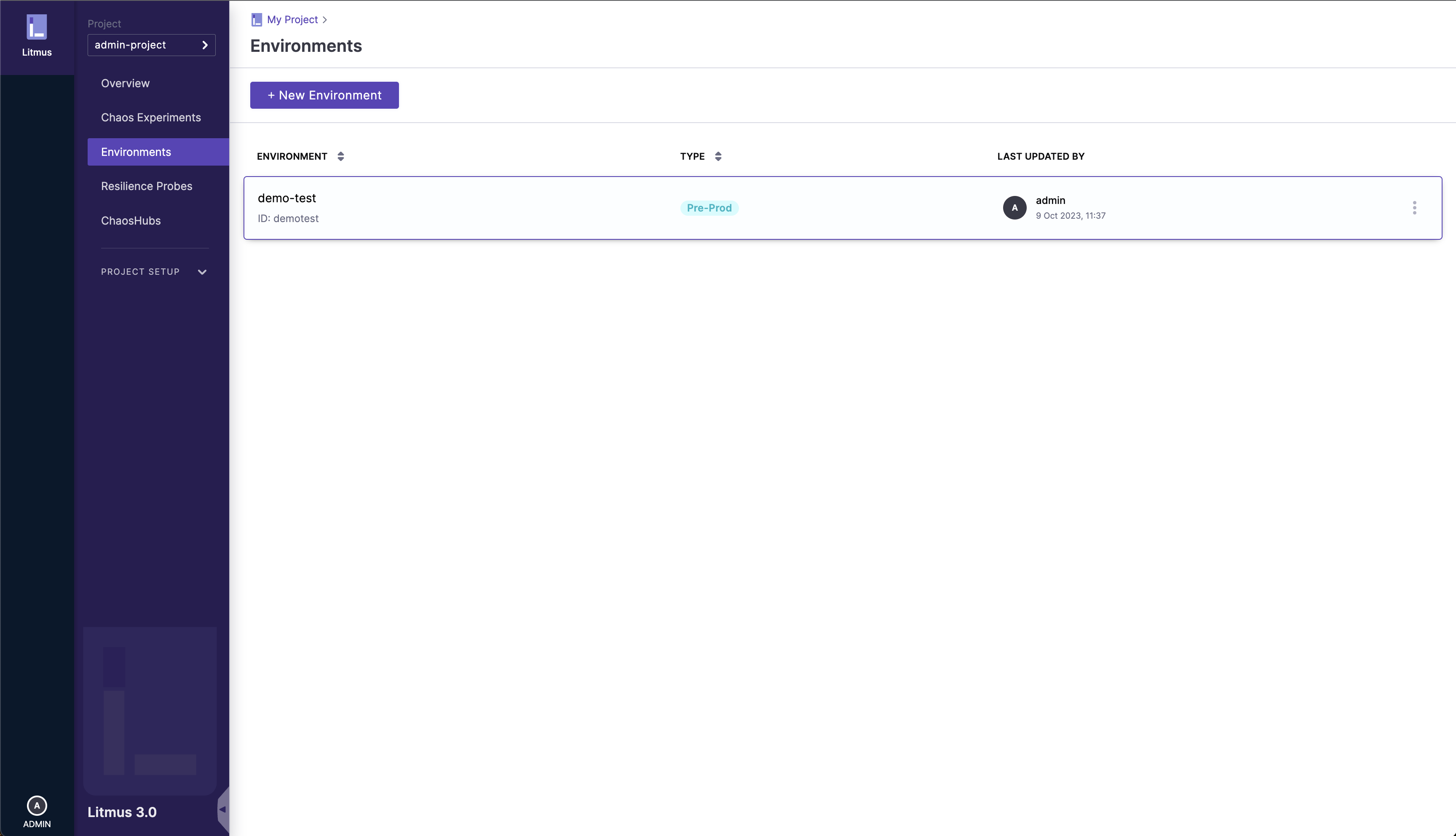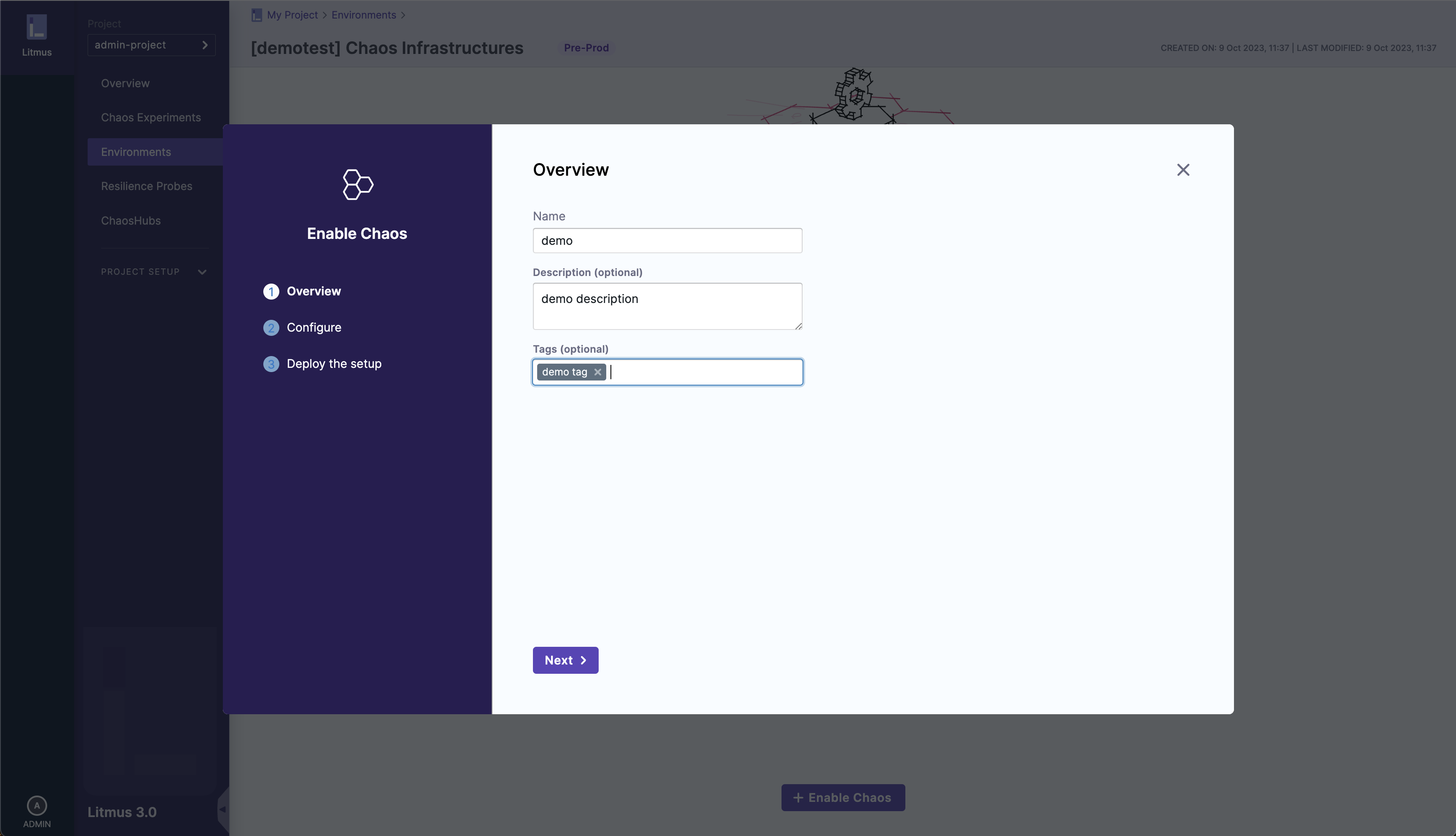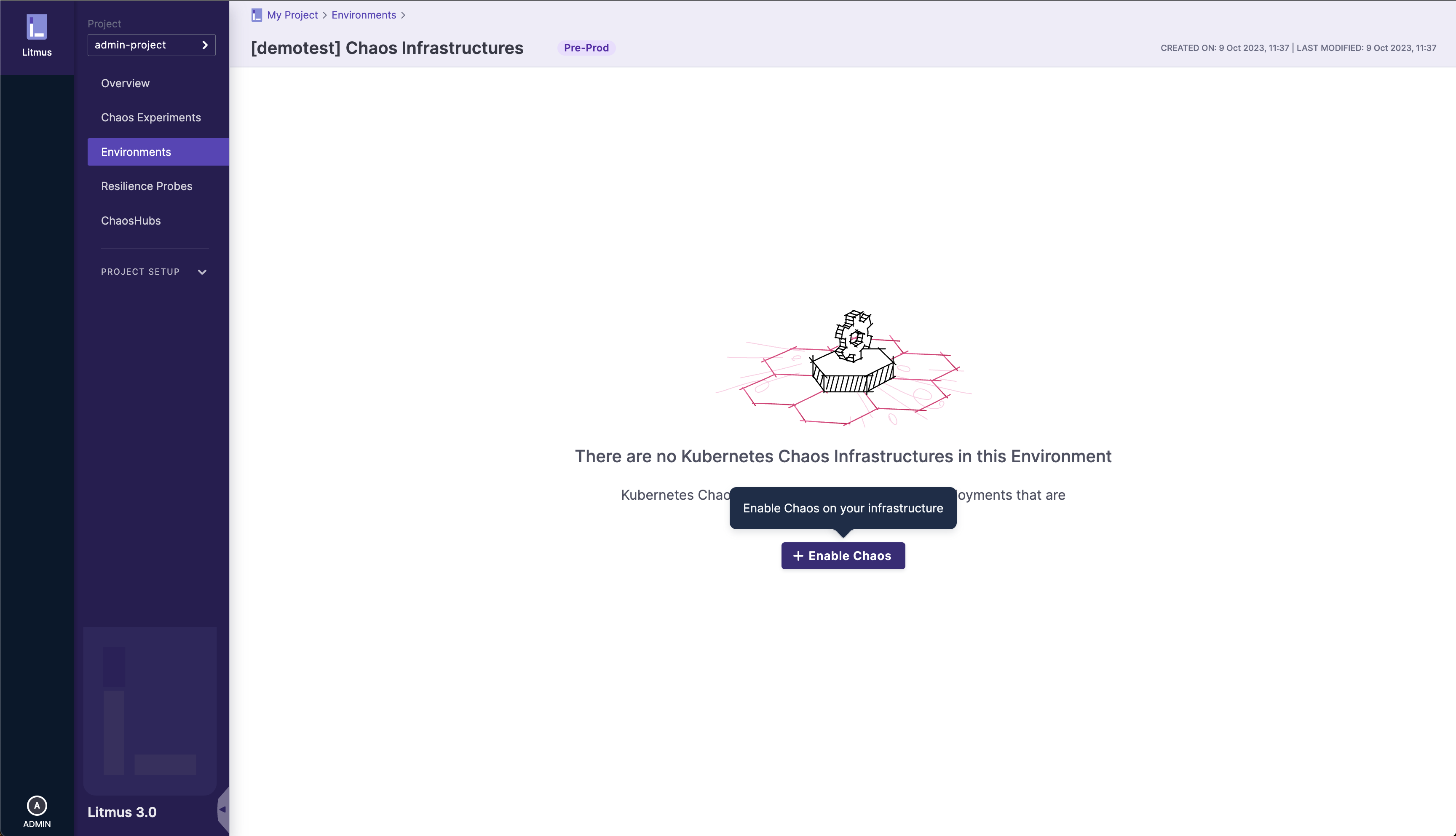 • You will need to create an environment for your chaos infrastructure to reside within. Environments are an abstraction layer over infrastructures, and a detailed guide on the environment creation process can be found here
