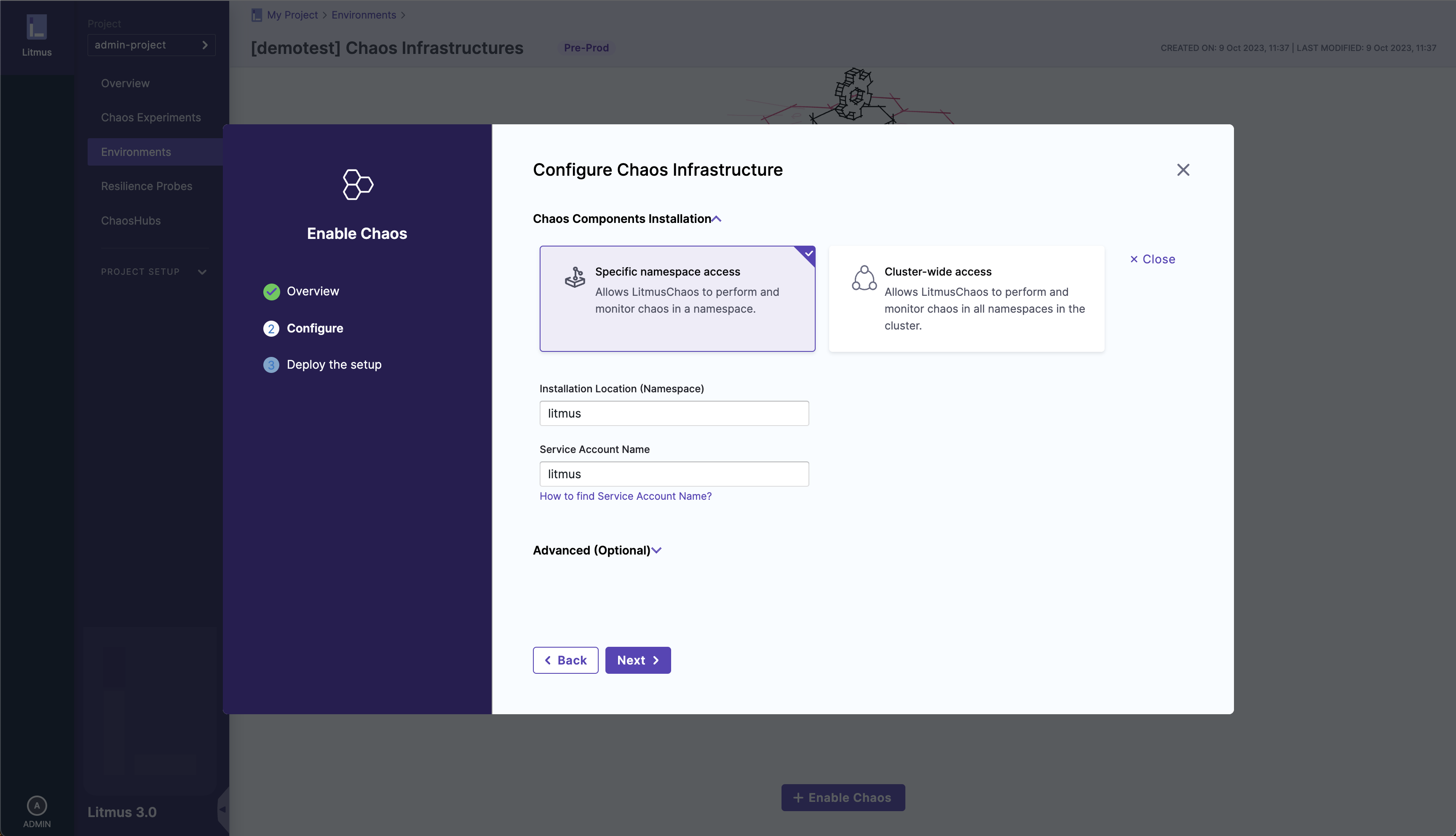 By default the installation will take place in the litmus namespace and uses litmus service account, which can be configured under the cluster details.