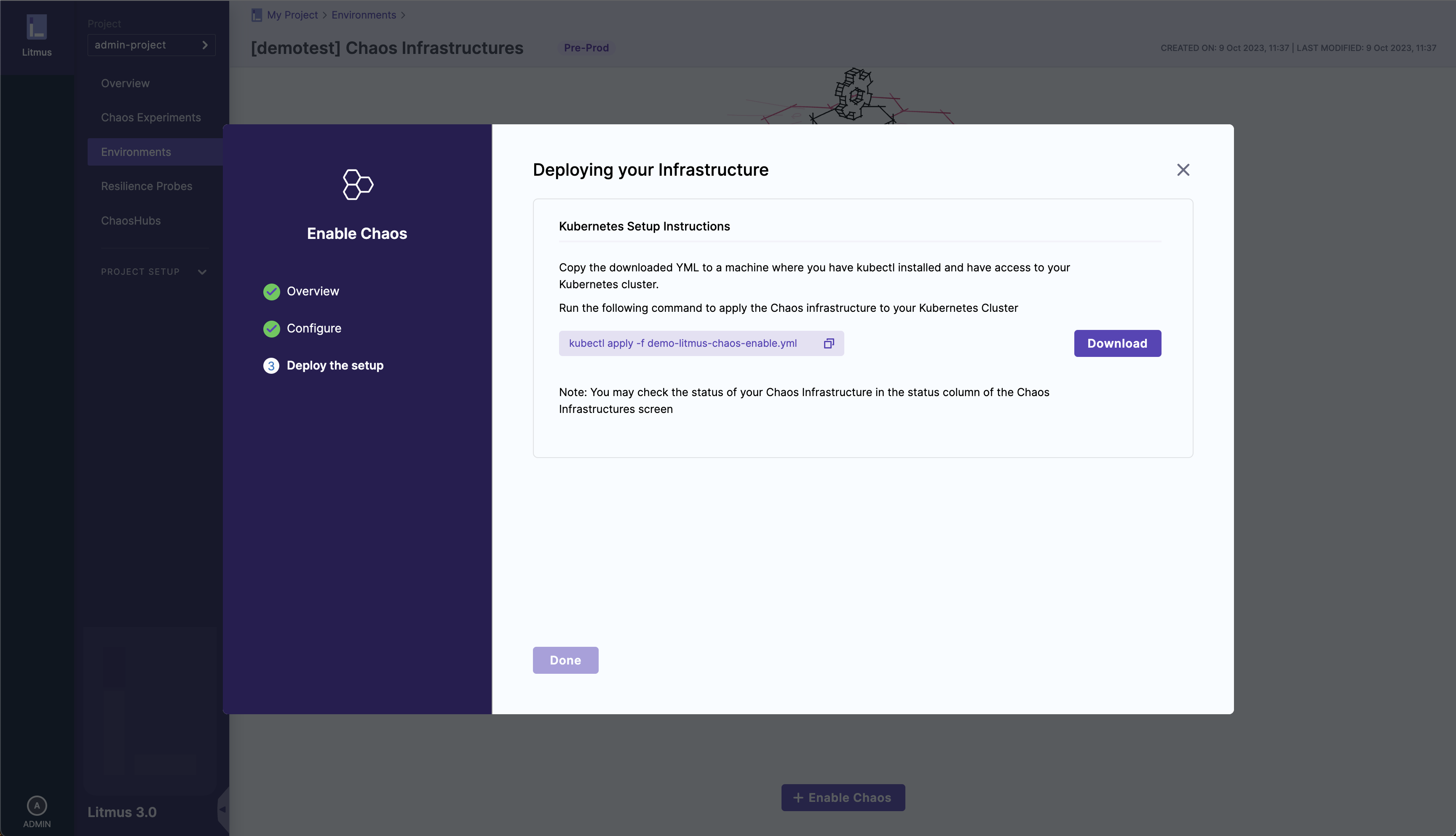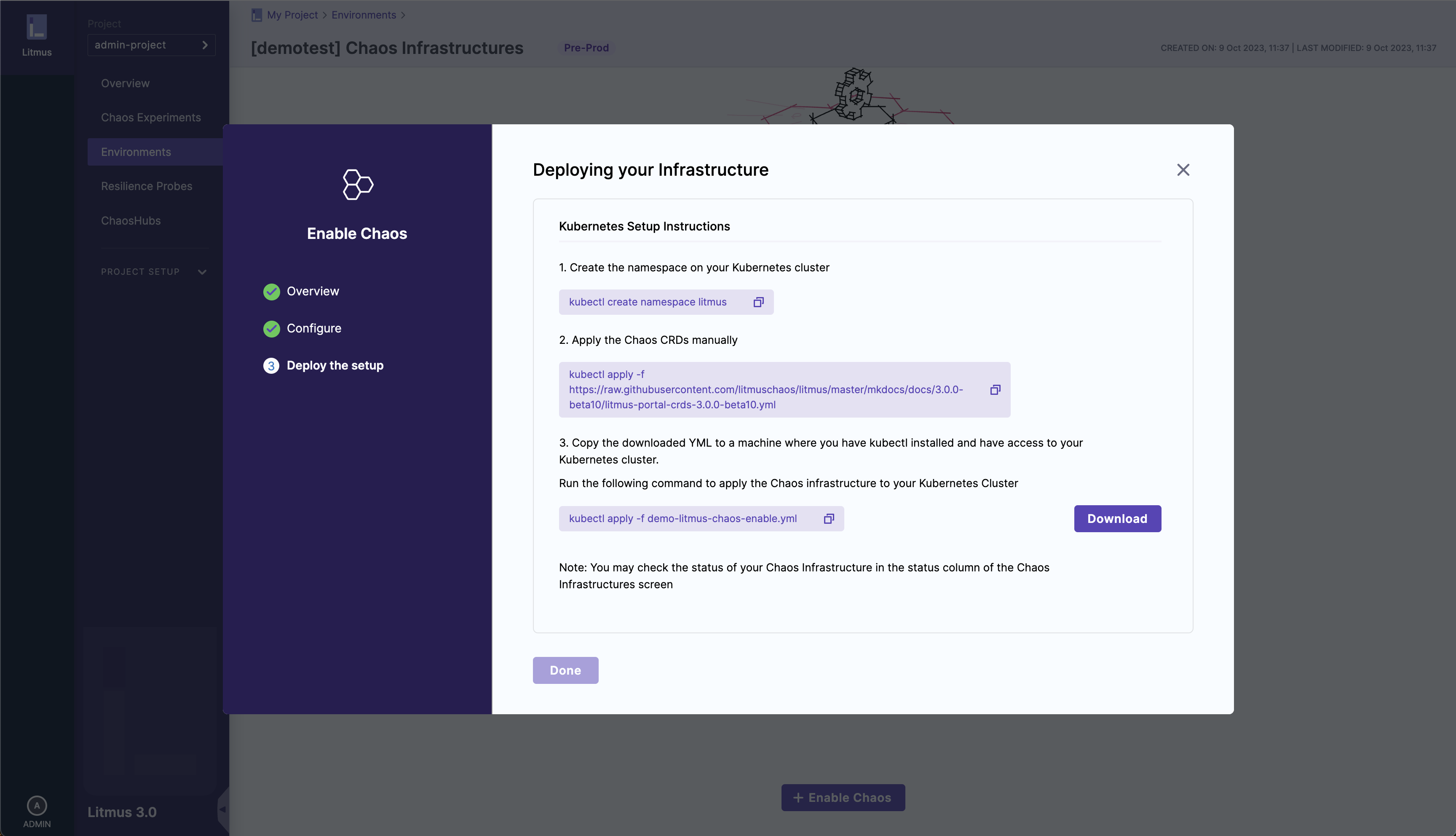 1. Select Download, and then copy and run the kubectl command shown on your screen to install the chaos infrastructure.